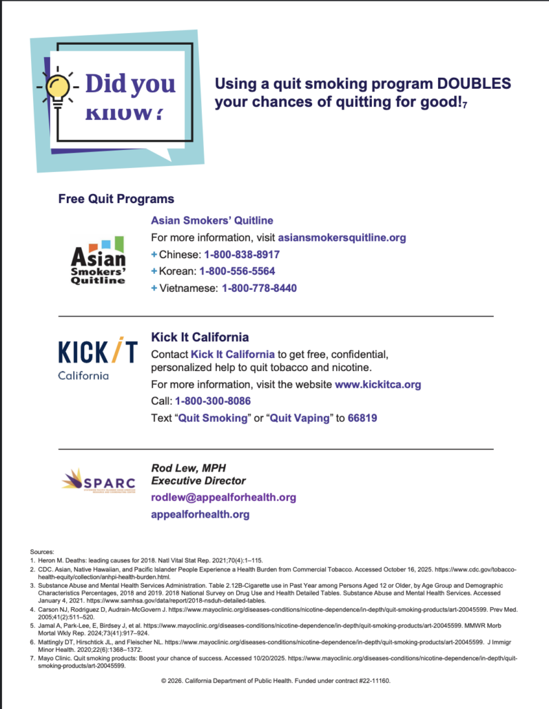 SPARC aims to foster interactive and integrative collaboration and communication among regional projects and others in the state working to reduce tobacco-related disparities among the diverse Asian American and Native Hawaiian and Pacific Islander (AA & NHPI) communities.